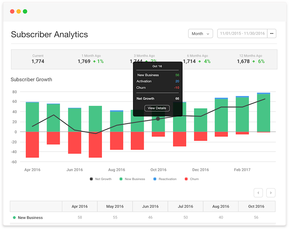 Our subscriber analytics report lets you compare new business numbers historically, as well as reactivation, churn and net growth, while freely setting your cohort.It makes it easy to see, at a glance, how your acquisition and retention efforts are performing, month over month.