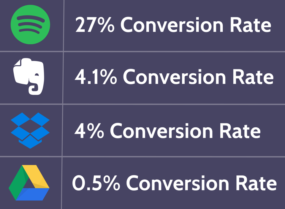 Spotify has an obscene conversion rate, 54 times higher than that of Google drive. But why? Sure, Spotify has a more limited free version, with advertisements and limited features.