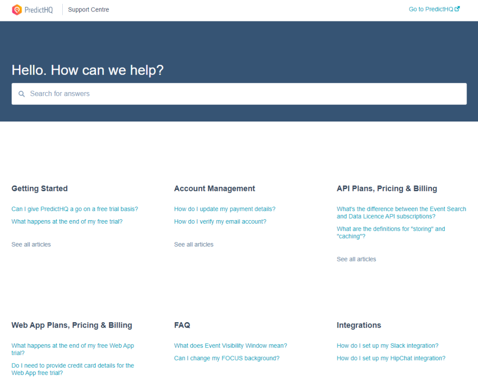 PredictHQ does a great job of empowering customers and giving them all the tools they need to succeed from within the online support center: the Quick Start walkthrough takes customers through the onboarding process step-by-step, developer docs offer detailed technical resources, and a searchable knowledge base covers almost every type of issue.