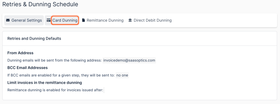 The foundation of a successful dunning strategy is taking steps to prevent accounts from going past due in the first place. Maxio’s interface provides out-of-the-box settings that let you take two important steps to keep card payments current and avoid declines:
