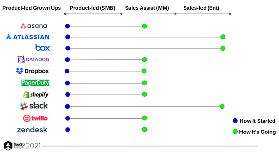 Today, many traditional sales-led (SLG) companies are introducing product-led tactics, experimenting with low friction, self-serve models to increase customer acquisition while PLG companies introduce sales teams and processes to move up market.