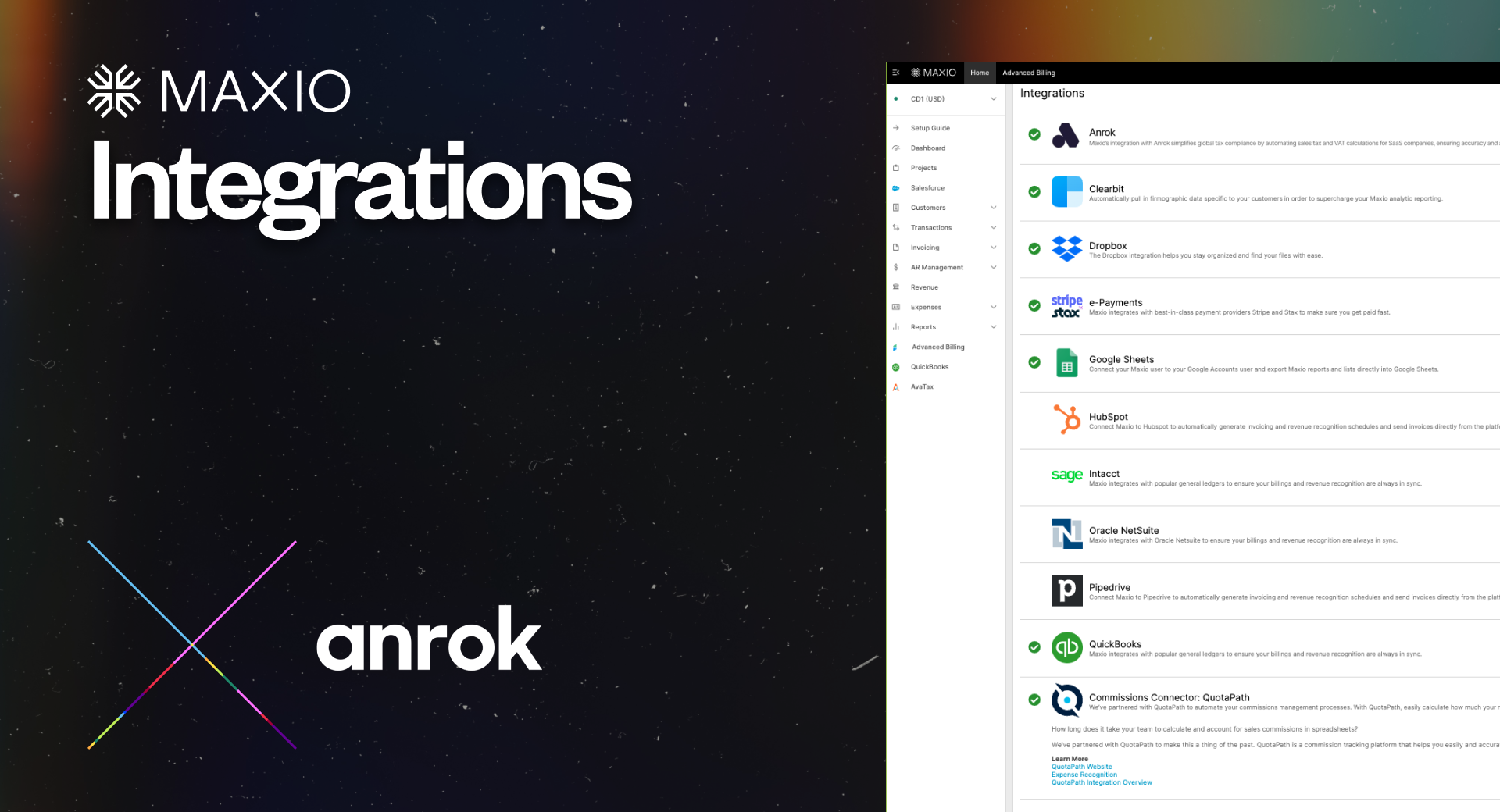 Compliance built in. Anrok manages jurisdiction-specific and international tax rules, while Maxio ensures invoices stay accurate, transparent, and audit-ready across regions.