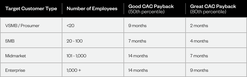 When considering benchmarking, you have to keep in mind that this metric varies significantly based on your market strategy and target customer persona. Here are some benchmarking details to consider when setting your own CAC payback period goals: